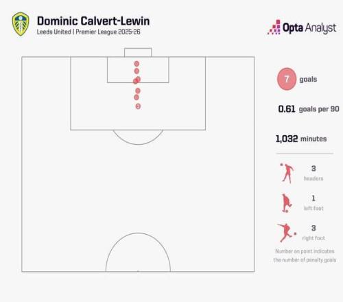赛后Opta对卡尔弗特-勒温本赛季的英超进球进行了分析,赛季至今这名英格兰前锋代表利兹联在英超出场15次,其中11次首发,打进7球,合计出场时间1032分钟,平均每90分钟打进0.61球。
